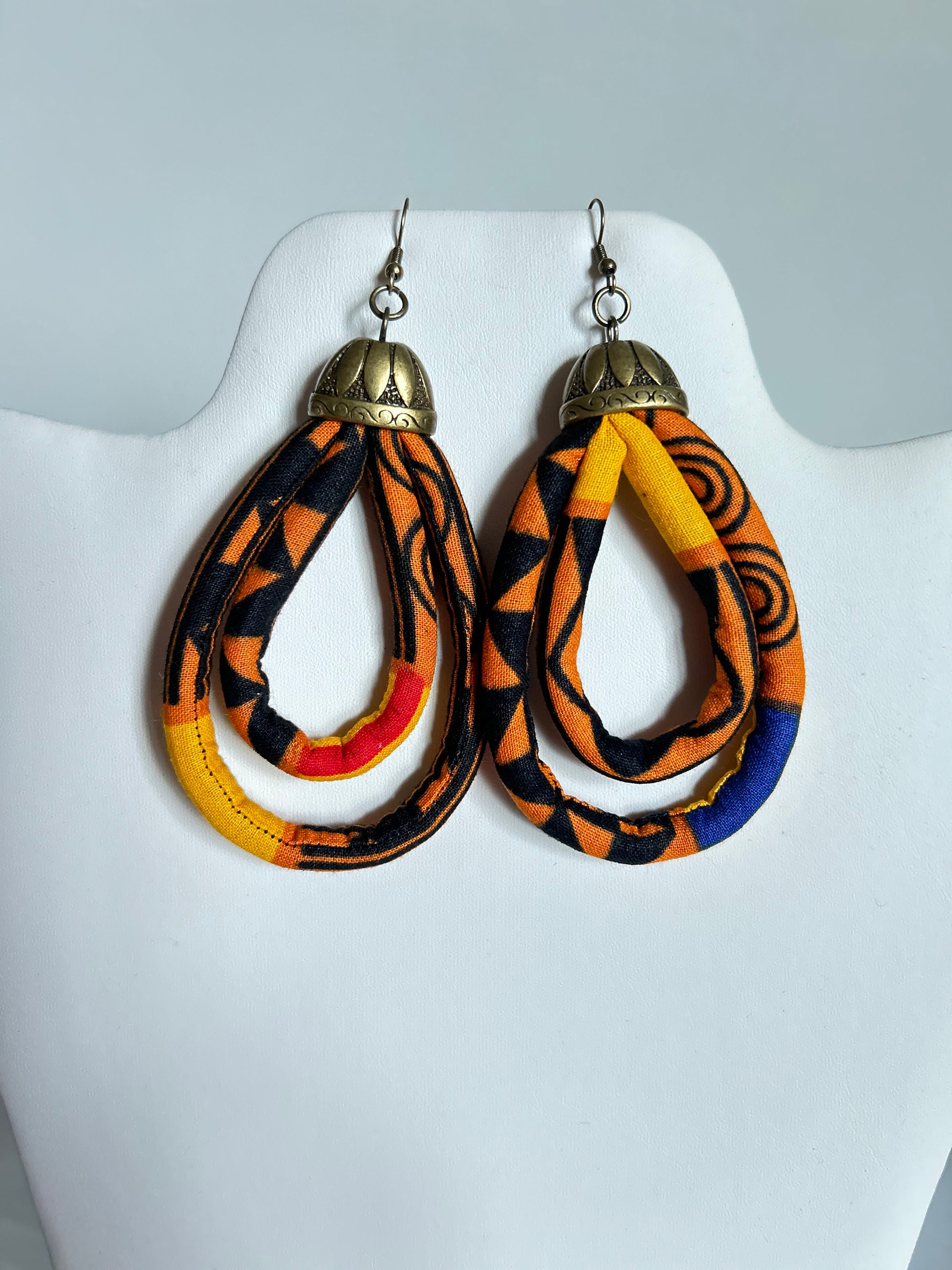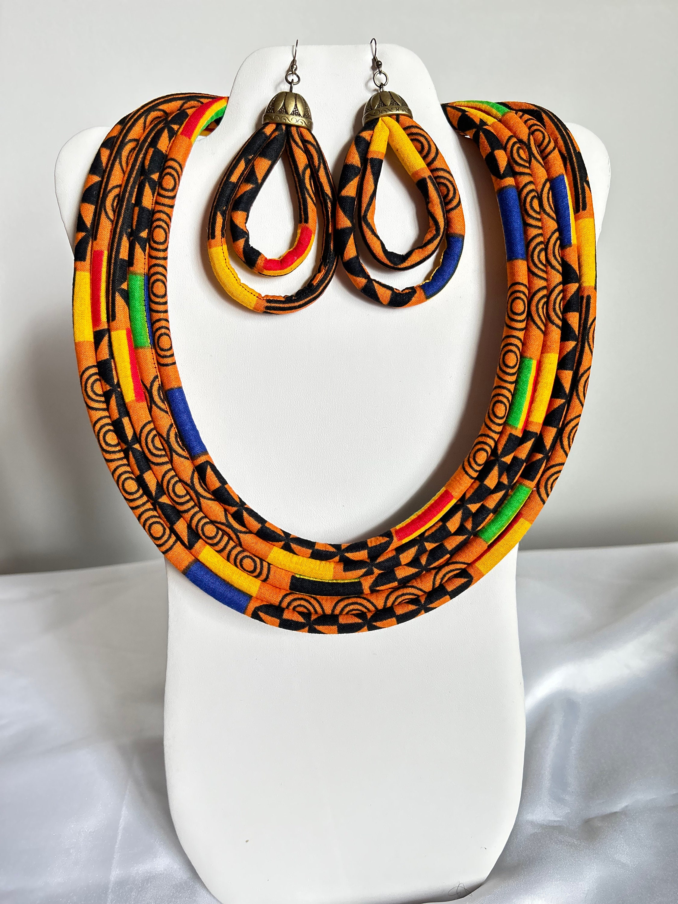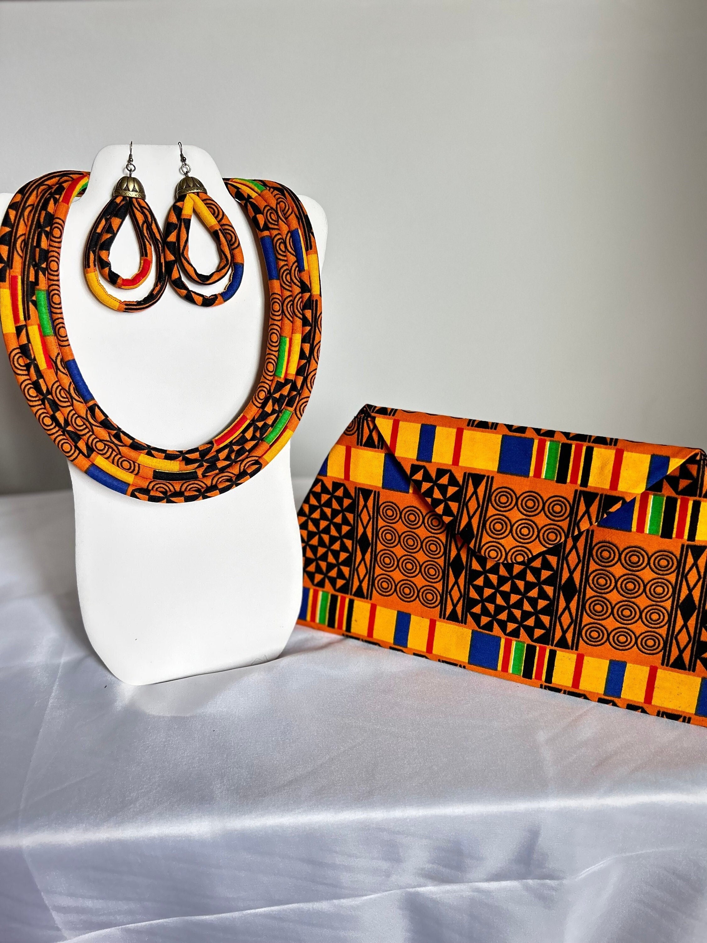 This stunning necklace is handcrafted from Ankara print fabric. It comes with matching earrings and a clutch bag. The necklace is approximately 18" long and closes using a toggle clasp; making it very easy to take on and off. The earrings have about 2.5" drop and are very light on your ears. The clutch bag is 14" wide at the bottom and top of the bag is 9" wide. It is secured by a magnetic snap. You can easily placed your car keys, cell phone, makeup and other personal items. This set is truly unique in that you can wear it all together or individually. However you choose to wear it will definitely make a statement